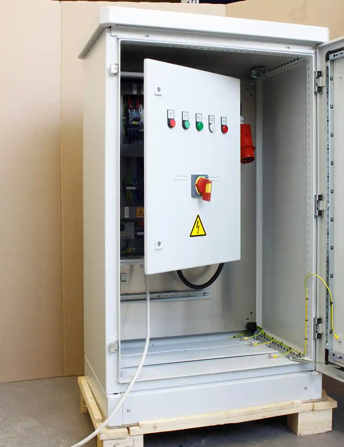 De besturing van de pomp bevindt zich in een robuuste schakelkast met een overzichtelijke opstelling van bedieningselementen om de pomp te besturen en te controleren.